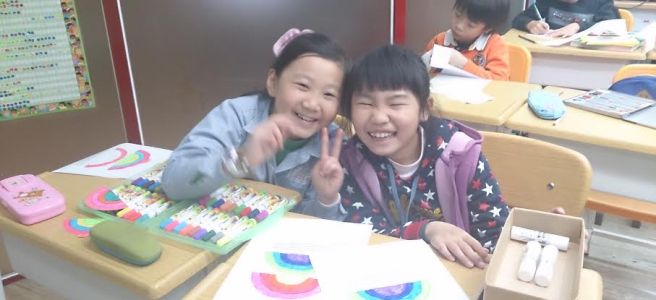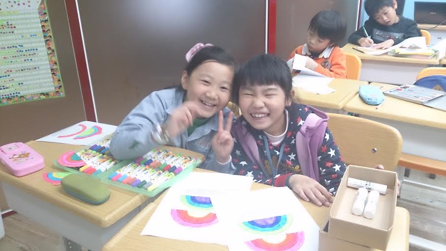 接著,學生練習圈字遊戲與填空,加強對相關單字的認識。在享用綠茶拿鐵、綠色茶點的下午茶時光中,課程在手做彩虹吊飾中愉快的告一段落。傳說中的愛爾蘭小精靈總是抱著彩虹末端的一罐金子,孩子們自由的在紙上畫上繽紛的色彩,剪出立體圖形,創作屬於自己的彩虹,也一起為這個節日增添了許多繽紛的裝飾。