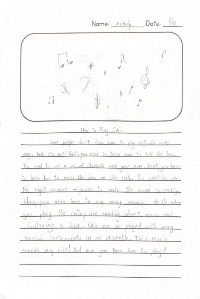 第二篇四年級Melody李欣桐就「如何彈奏大提琴」“How To Play Cello” ,這個較難發揮的題材下手,她聰明的運用了英文寫作技巧中很重要的“sequencing”(順序性): “First, next,”,歷歷在目的將我們帶到她的視野,跟著她讀譜拉弓彈奏。