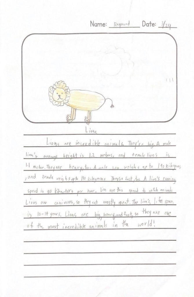 第一篇 “Lions” 「獅子」,三年級的Raymond江豐邑成功的以撰寫informational text (資訊類文章)的筆觸,告訴了我們為何獅子為動物之王,從他敏銳的觀察獅子的外觀特質,熟練的運用英文的單位詞(meters, kilograms, kilometers)來精準的區分公獅和母獅的體型差異及肉食特性。好樣的, Raymond!