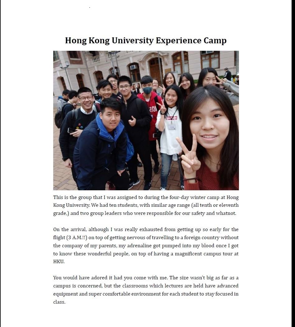 被學生與家長譽為「高中生涯中最宇宙無敵優質且具高度競爭性的冬令營」- 香港大學體驗營,日前在香港薄扶林的校本部熱烈的舉行。我們聰慧的王以慬同學,特別為她的四天行程,做了第一手的特派報導。