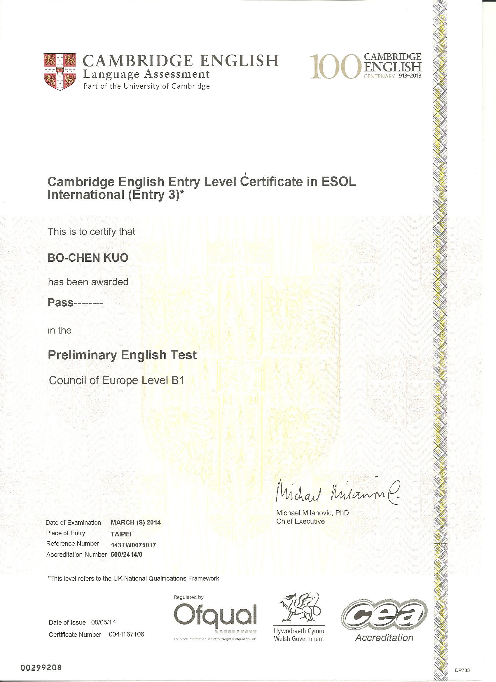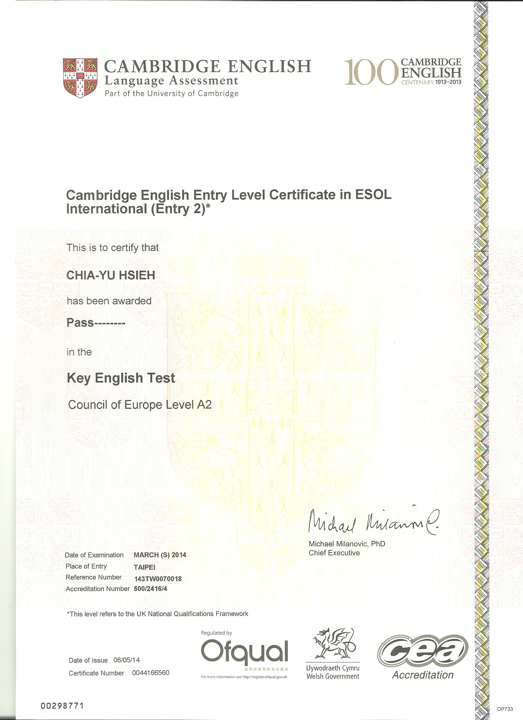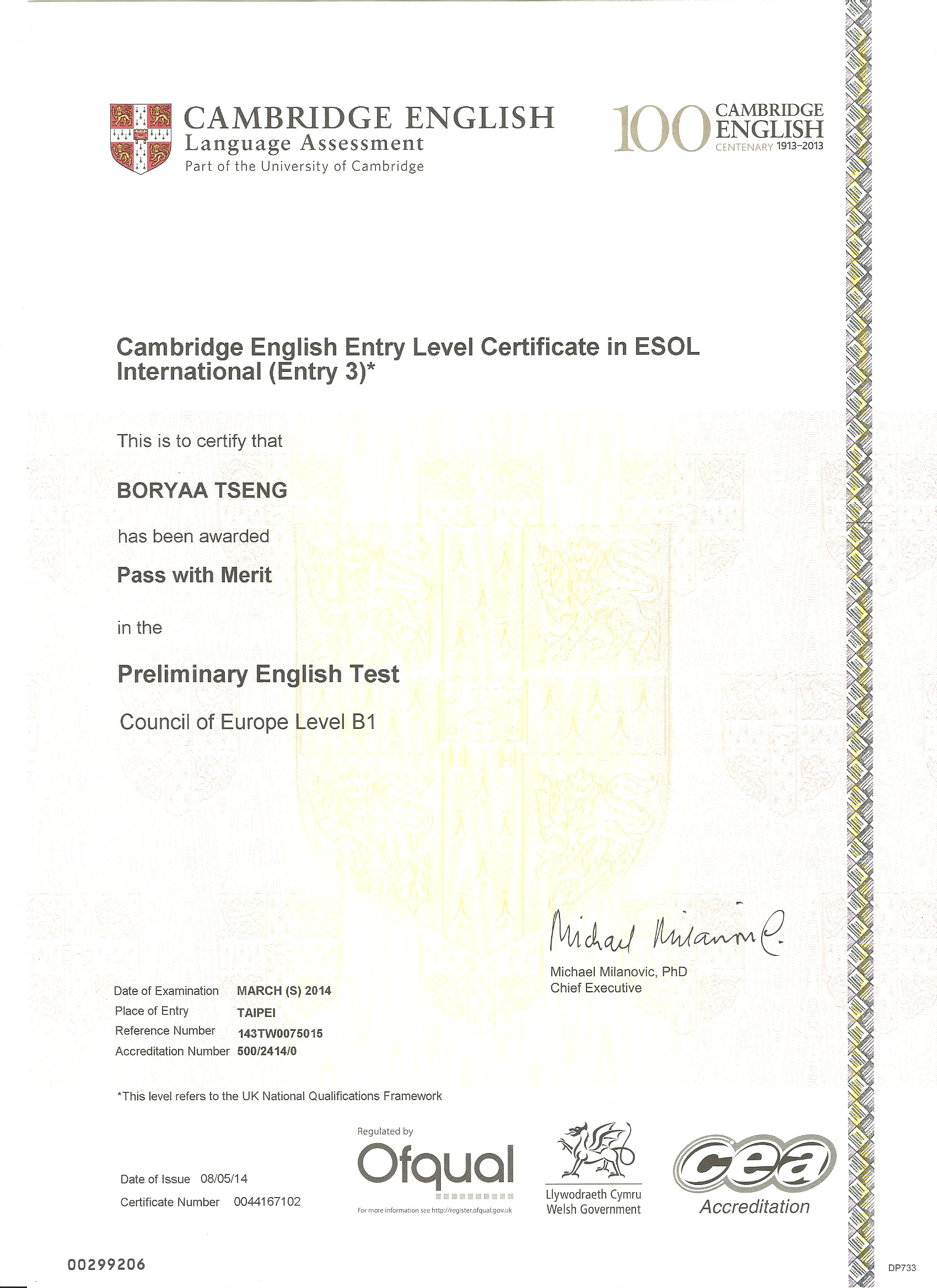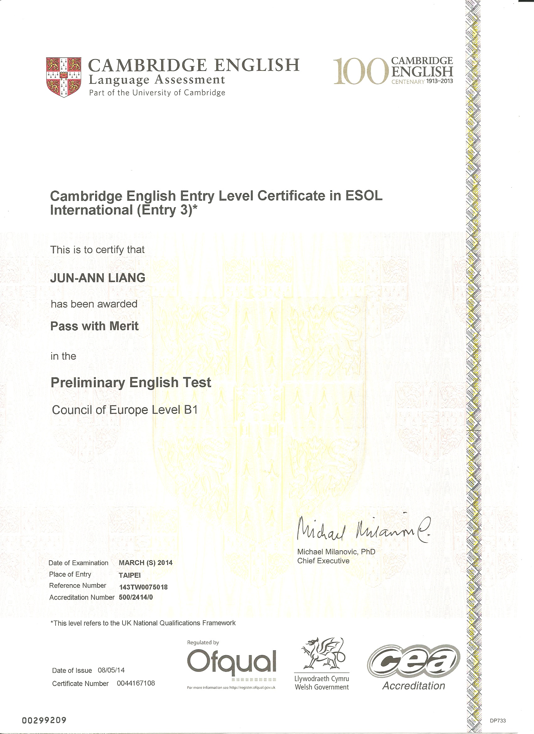 恭喜本班南山國中二年級賴昱尚同學, 竹林中學三年級蕭嬙同學, 通過全民英檢中級複試, 正式取得認證通過! 「全民英語能力分級檢定測驗」103年第一次中級寫作及口說測驗成績揭曉,寫作測驗平均成績3.5級分,口說測驗平均成績3.6級分,通過率為32%。 同時恭喜梁君安(Alisa)、曾伯雅(Boyaa)、徐鈺婷(Yuki) 與熊心語(Amber)一路過關斬將,取得劍橋PET的認證資格,等同於高中畢業程度與全民英檢中級的程度。 此外,本班通過KET測驗的同學有小學四年級的賴昱雯(Emily)、劉子裔(Andrew)、謝佳妤(Karen),取得了等同全民英檢初級的認證。